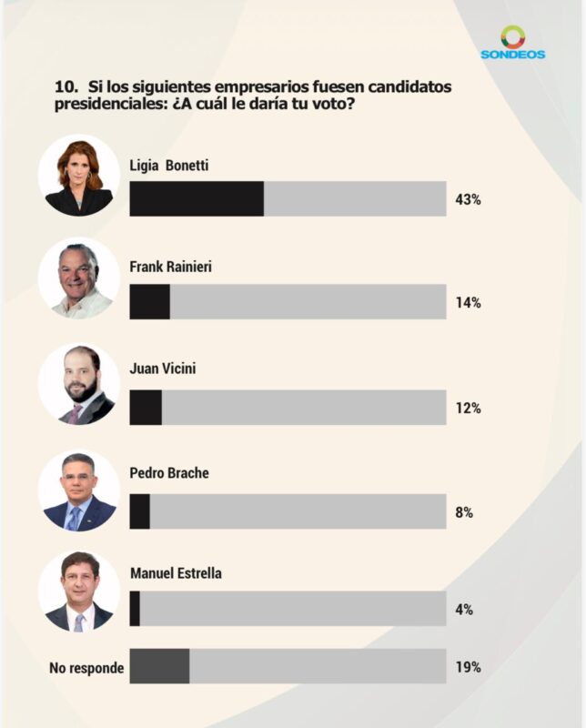 El posicionamiento de Ligia Bonetti como la figura empresarial mejor valorada en un escenario hipotético presidencial no pasa desapercibido en el tablero político nacional. Aunque el estudio de Sondeos no midió intención de voto partidaria, el alto nivel de aceptación ciudadana que alcanza la presidenta ejecutiva del Grupo SID envía una señal clara sobre el desgaste de las figuras tradicionales y la creciente apertura del electorado a perfiles provenientes del sector privado.